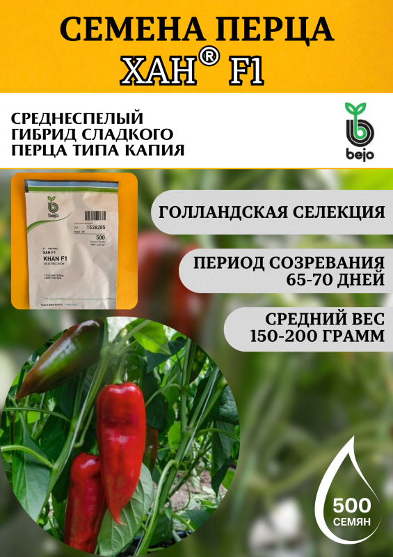 Хан F1 — среднеспелый гибрид сладкого перца от голландской компании Bejo сортотипа Капия. Сочетание выровненных плодов с отличными вкусовыми качествами и надежной устойчивости к заболеваниям делает его стабильным выбором для различных условий выращивания.