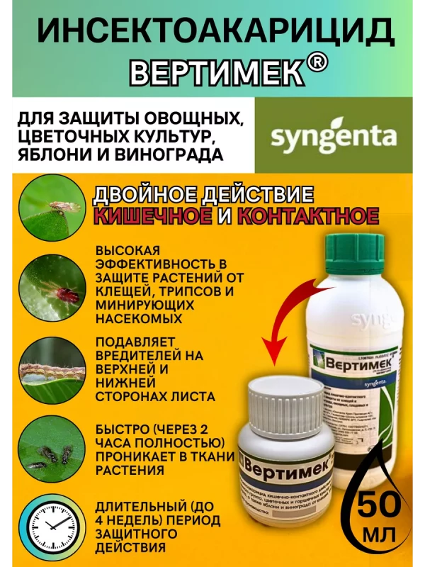 Вертимек - инсектоакарицид кишечно-контактного действия для защиты овощей защищенного грунта, цветочных и горшечных культур защищенного и открытого грунта, а также яблони и винограда от клещей, трипсов и яблонной медяницы.