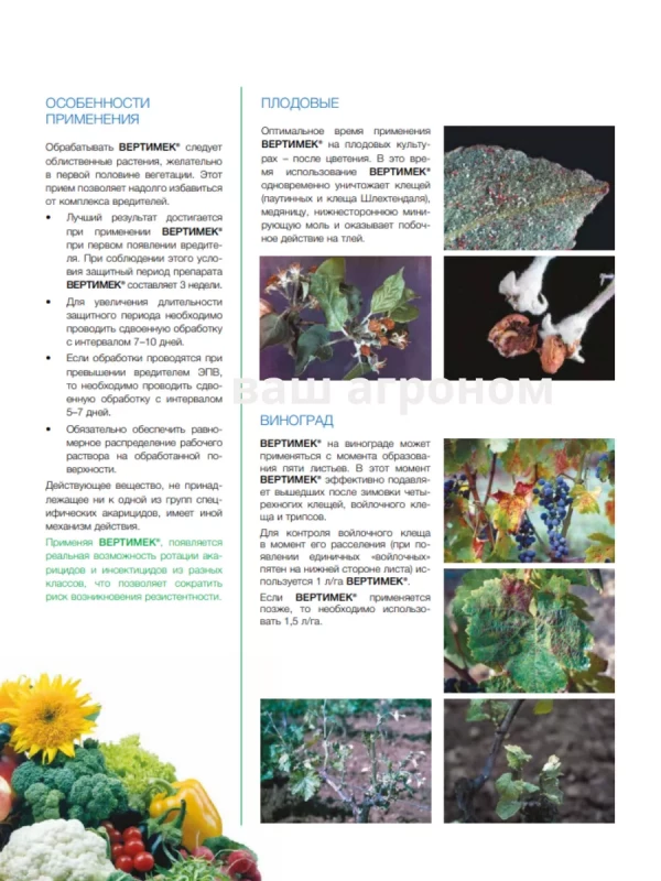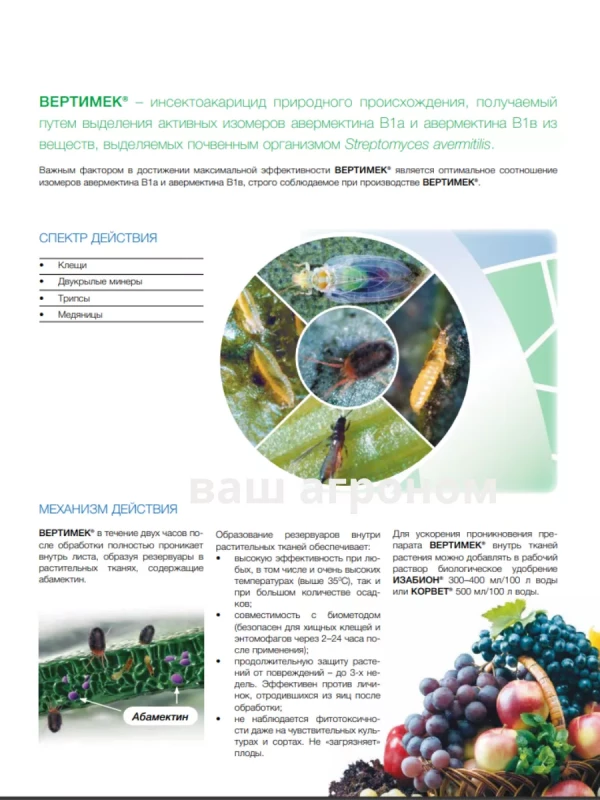 Вертимек – инсектоакарицид кишечно-контактного действия для защиты овощей защищенного грунта, цветочных и горшечных культур защищенного и открытого грунта, а также яблони и винограда от клещей, трипсов и яблонной медяницы.