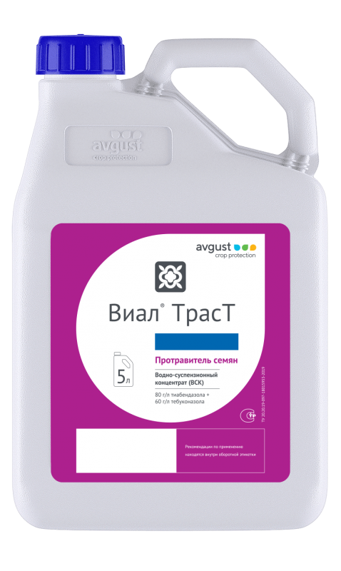 Виал ТрасТ — это высокоэффективный двухкомпонентный фунгицидный протравитель семян от компании АО Фирма «Август» с добавлением антистрессовых компонентов. Препарат предназначен для защиты зерновых культур и подсолнечника от широкого спектра болезней. Обладает исключительно высокой эффективностью благодаря тщательно подобранной комбинации двух действующих веществ с различным механизмом действия, а также оказывает ростостимулирующее действие.